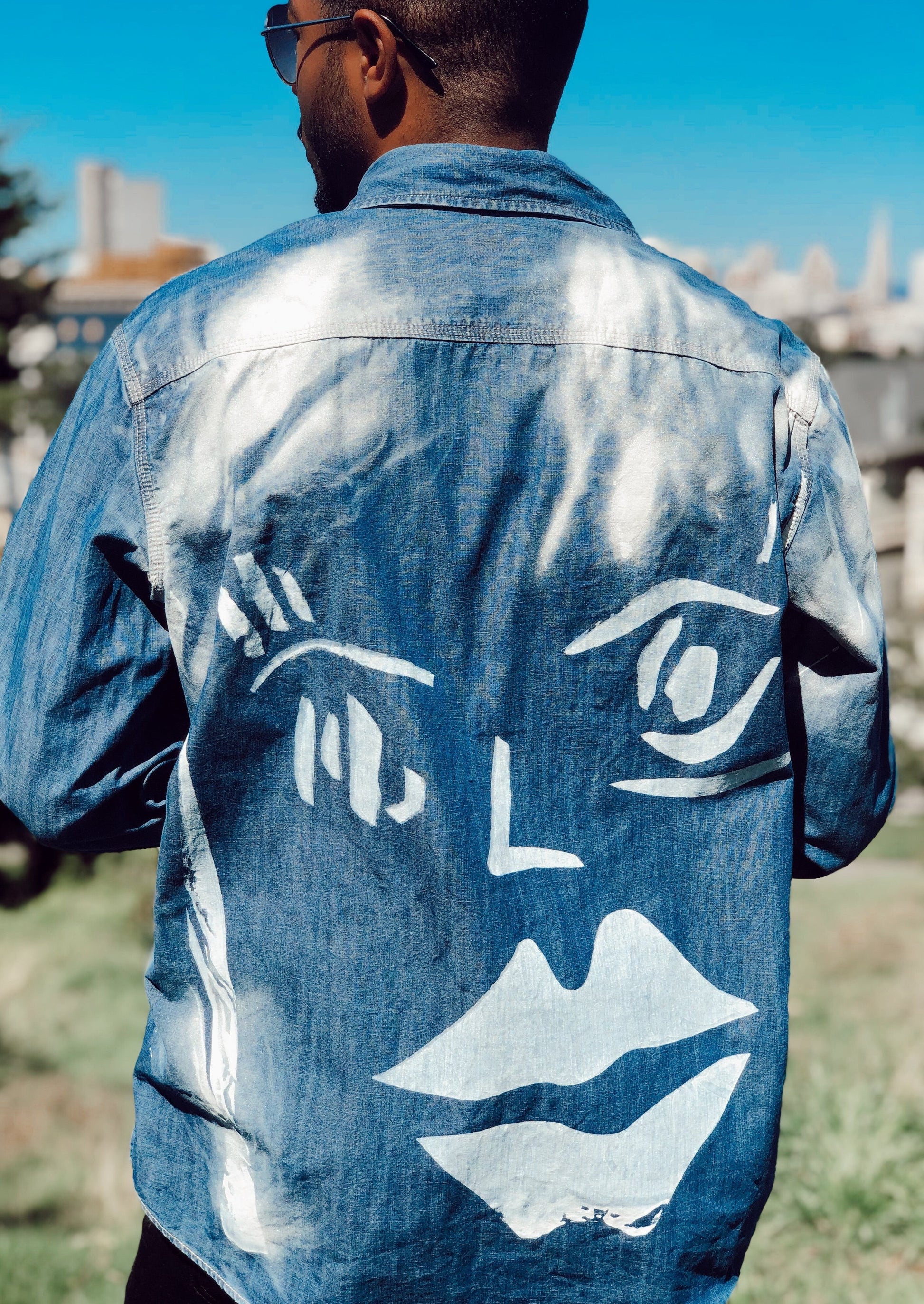 denim up-cycled screen-printed long sleeve button down. 1 of 1 design.