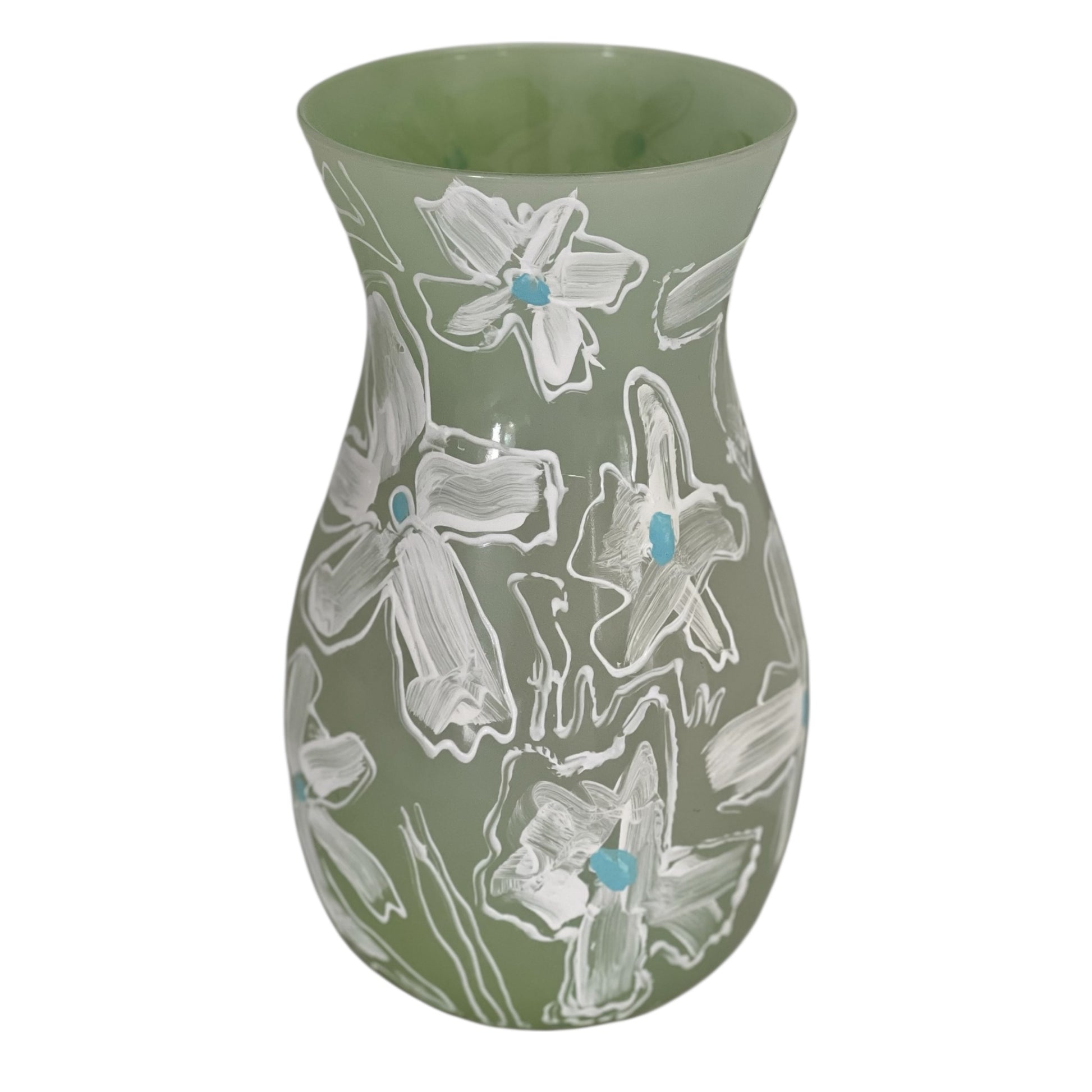 Enhance your living space with this unique hand-painted glass vase, meticulously crafted on a clear large-sized vase. Each piece is one of a kind, designed to bring an immediate touch of sophistication to your decor.